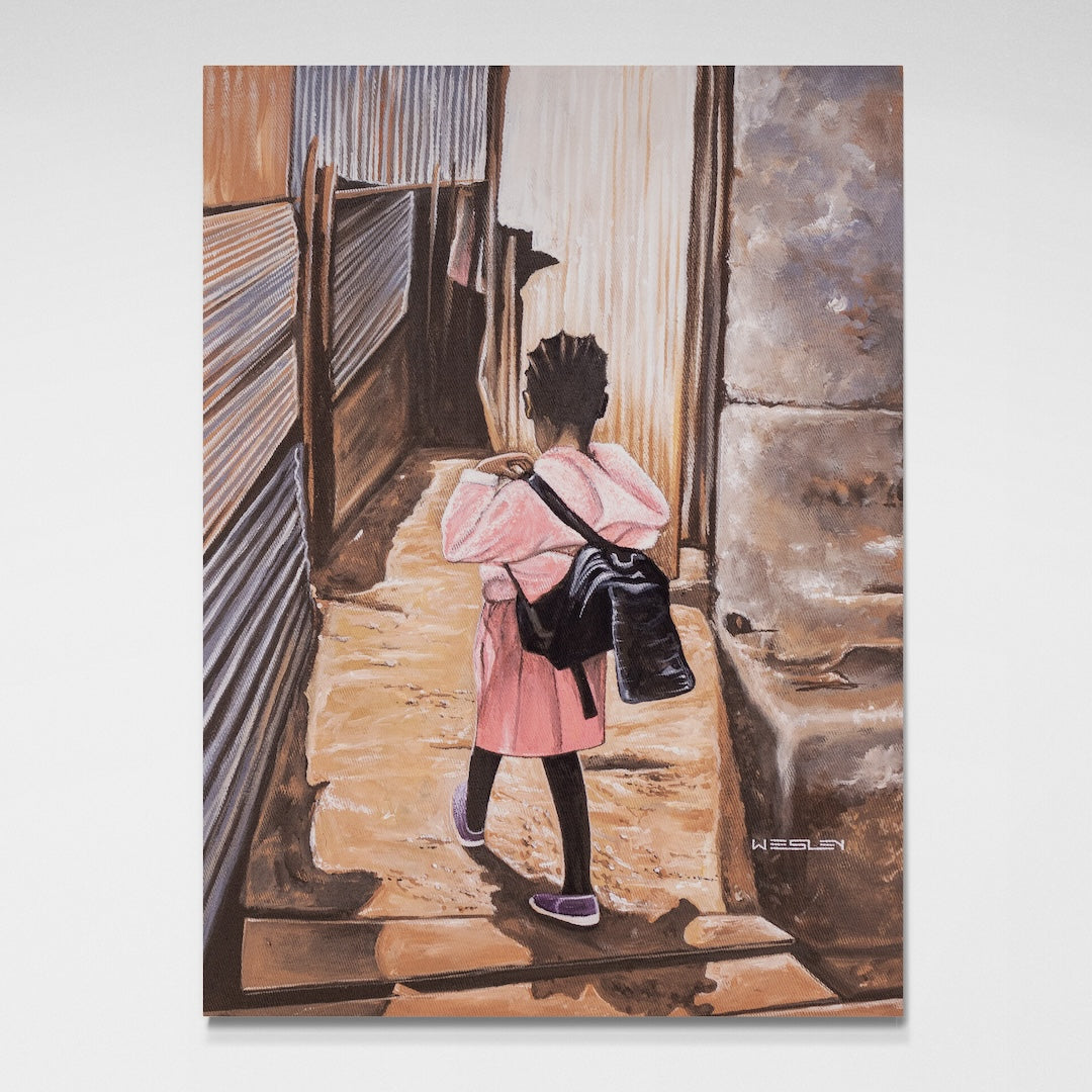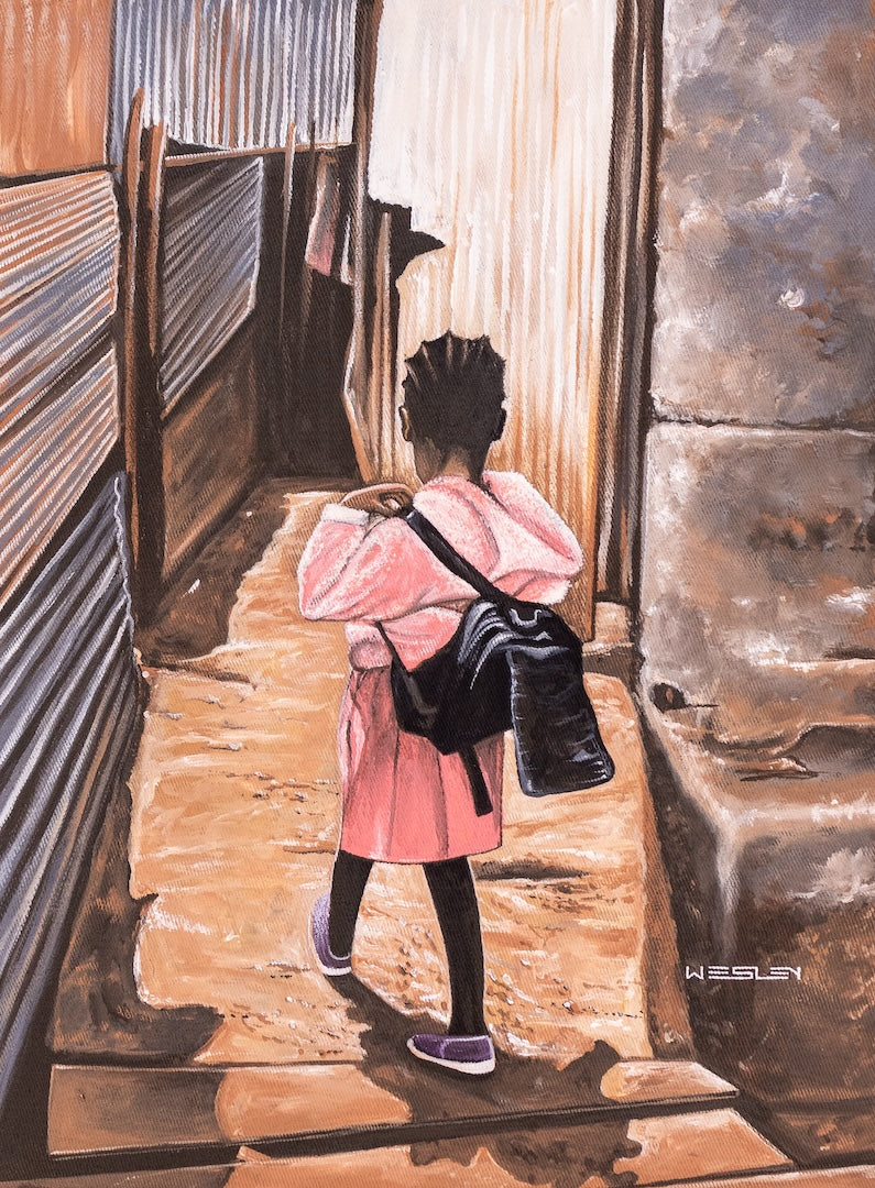 This piece was created at the Uweza Art Gallery by a youth artist living in the Kibera slum of Nairobi Kenya. 60% of the proceeds of this sale will go to the artist and 40% will go toward the operations of our art gallery, which provides opportunities for creative expression and development of artistic talent for children and youth living in Kibera.