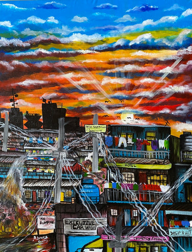 This piece was created at the Uweza Art Gallery by a youth artist living in the Kibera slum of Nairobi Kenya. 60% of the proceeds of this sale will go to the artist and 40% will go toward the operations of our art gallery, which provides opportunities for creative expression and development of artistic talent for children and youth living in Kibera.